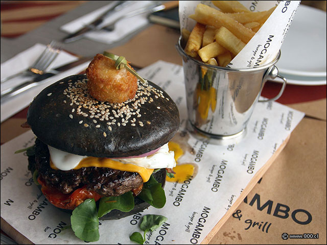Premium Morango Smoked Burger con un pan broche teñido con tinta de calamar