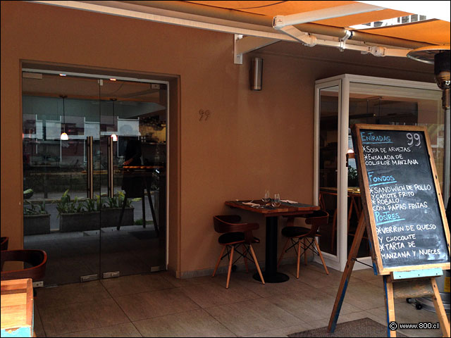 Acceso al restaurante 99 y pizarra con el menú degustación del momento