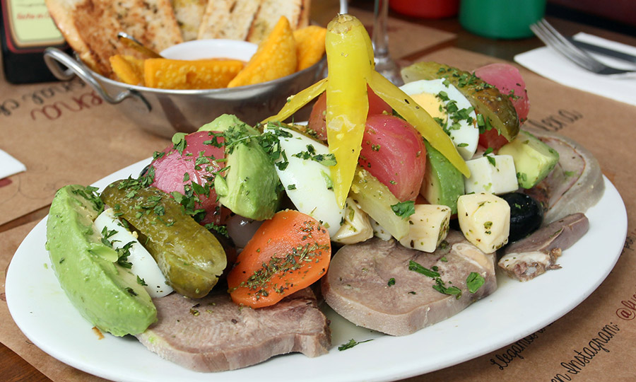Una pichanga chilena elegante tan generosa como para llevar una palta entera, abundante lengua ajamonada, arrollado sabroso hasta el fondo y un surtido regalón de escabeches como pepinillo, cebolla, coliflor, zanahoria, ají verde y aceitunas negras que acompañan el huevo duro, el queso mantecoso y su queso de cabra. Y como si fuera poco, viene acompañado de un platillo con sopaipillas con pebre y pancitos. Simplemente fabulosa.