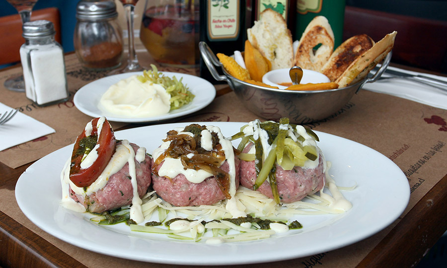 Tres enormes bolas de una cremosa carne cruda prealiñadas montadas en tres versiones, una coronada con tomate confitado, otra con cebolla caramelizada y una tercera con pepinillos encurtidos, todas sobre queso rallado con toque de pesto y mayonesa, y para complementar, un platillo con bastante mayonesa y ají verde y otro insaciable de sopaipillas con pebre y pancitos. Es casi imposible comerse solo esta delicia de la Fuente Chilena.