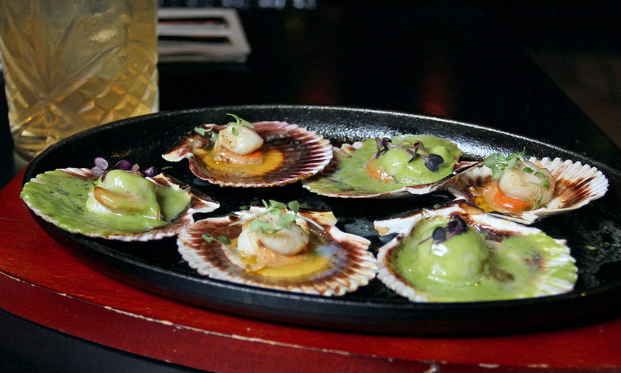 Ostiones en dos versiones: una más refinada, bañada en mantequilla con especias anizadas, y la otra, envuelta en una suave salsa verde de cilantro.