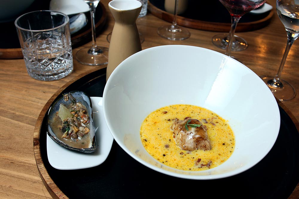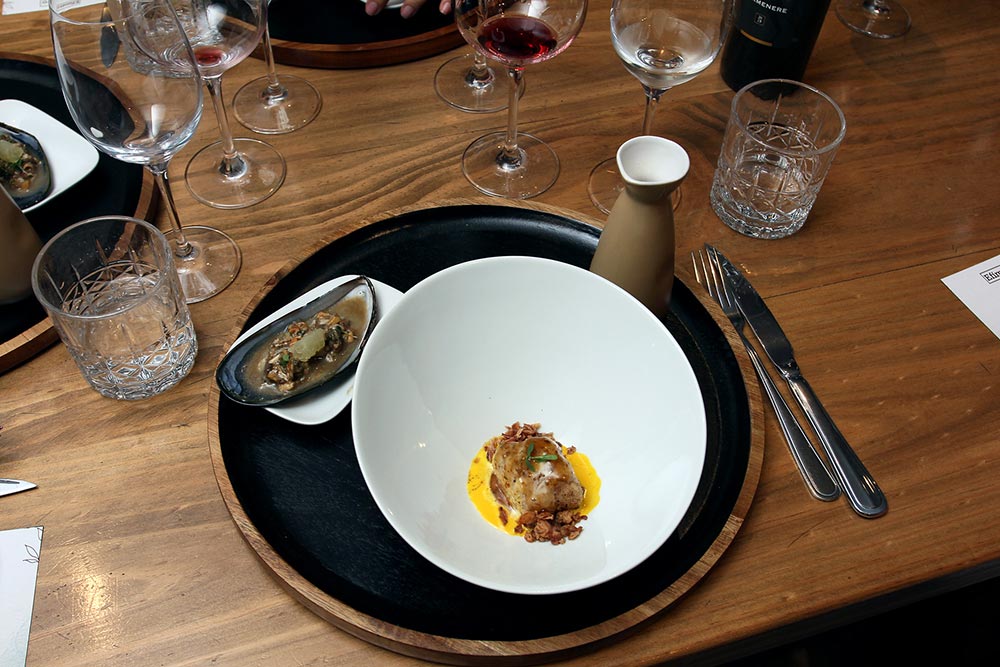 Congrio en caldo con almejas y piure. Una de construcción de un caldillo de congrio en 3 partes, lleno de texturas y sabores marino. Un congrio de provocación y balance.