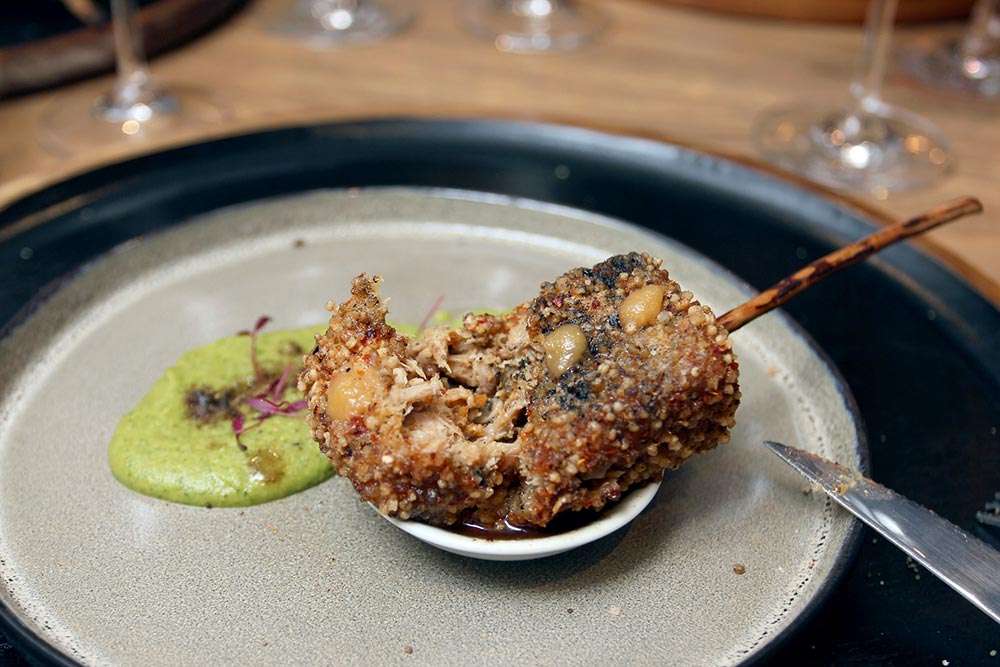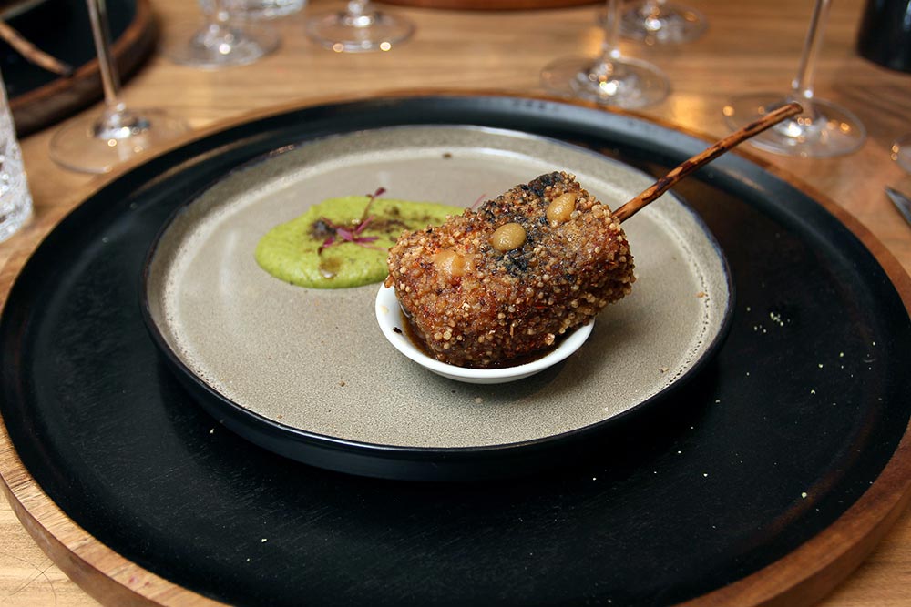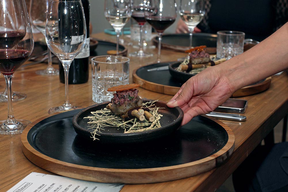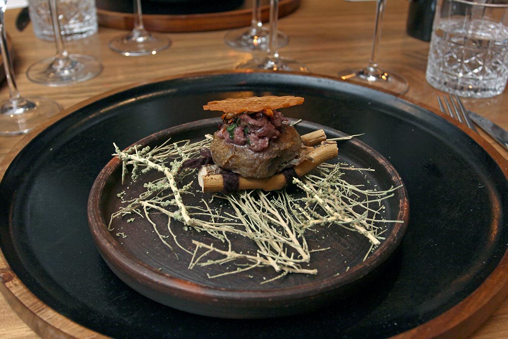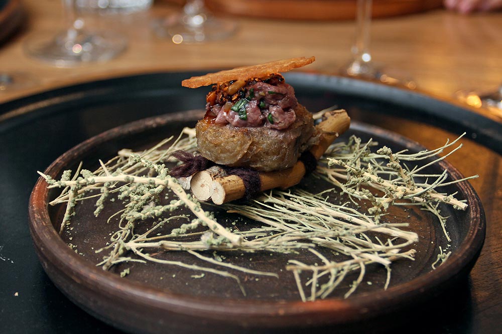 Tartar de guanaco con avellanas chilenas sobre un milcao con guanciale ahumado, y fermentos, en elaborado montaje con ramas de rica rica. Atrevido.
