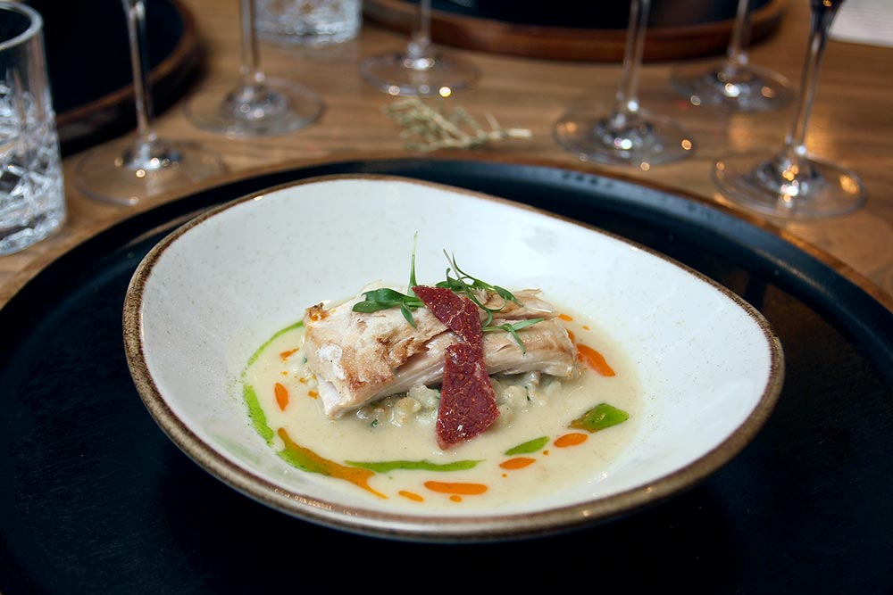 Pescado de roca, en este caso cabrilla ahumada con precisión sobre un cremosos mote de autor. Sublime y chileno.
