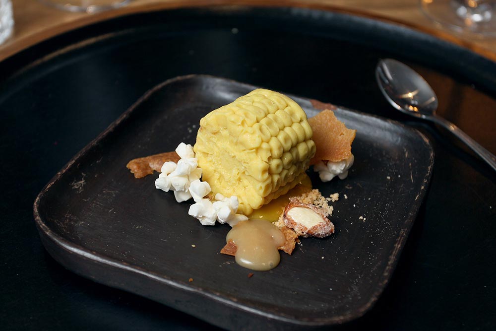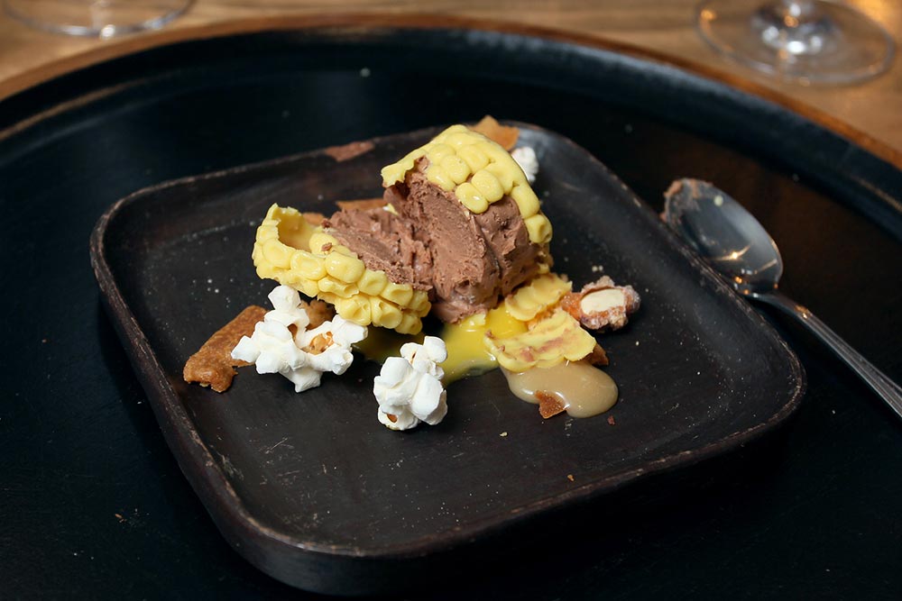 Hermoso y perfecto falso choclo de chocolate blanco relleno de mouse helado de chocolate con cabritas, almendras garrapiñadas, crocante de y salsa de naranja. Arte, vanguardia y talentosa repostería.