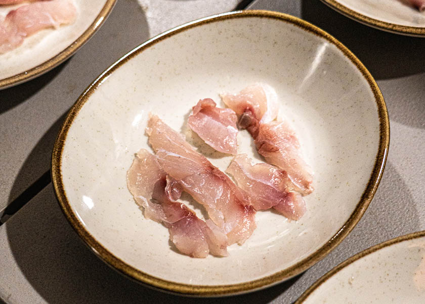 - Luego, un tiradito de pescado blanco con leche de tigre y piure, donde el mar se expresa en profundidad y umami.