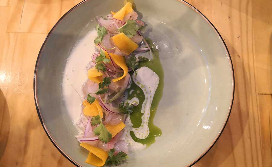 En este caso, unas frescas y finas láminas de reineta que se entrelazan en una bella presentación con cebolla y mote crocante y encurtidos, además de jugo de pepino y dashi de manzana. Un plato suave y algo crocante, con un juego de ingredientes que le da una entretenida personalidad a esta clásica receta.