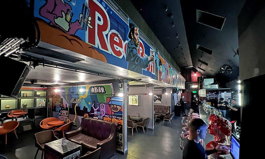 A esto se suma una intervención del muralista chileno, El Dorian Pinta, y otra del artista urbano Seco Sánchez, quien realizó un graffiti icónico de los vagones de un tren de New York pintado por Donald Joseph White, alias Dondi, quien fue uno de los grafiteros más influyentes y pioneros del mundo a finales de los años 70 hasta principios de los ‘90. Sus baños tampoco quedan fuera, ya que los lavamanos son barriles de petróleo pintados de forma personalizada para el bar.