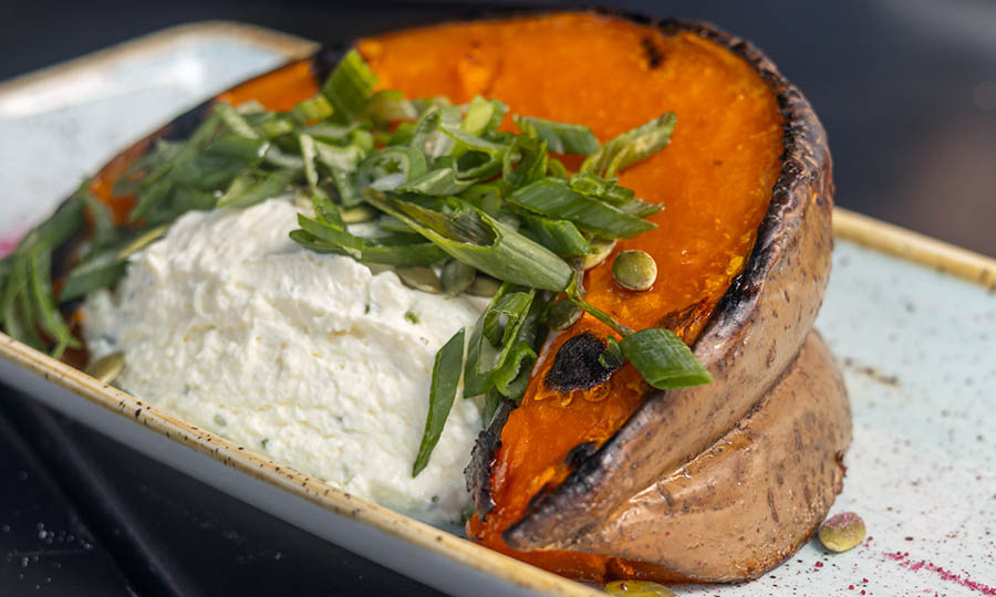 Sorprende a la vista y al comerlo, es para copiarlo en casa y lucirse con los amigos. Es una verdura a las brasas lúdica y sensual de un preciso corte de zapallo y que adora esa sour cream.