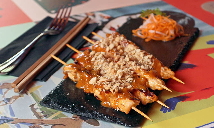 Brochetas de pollo marinadas por 24 horas para luego ser preparadas en el momento con una salsa hecha en el local a base de maní, curry y especias tailandesas. Esto hace que el pollo esté jugoso y con una buena consistencia. Crocancia, gracias al maní, y cierta dosis de dulzor también son parte de esta tradicional receta. Además, viene con unos nabos y zanahorias encurtidos en vinagre de arroz que le dan un entretenido twist.