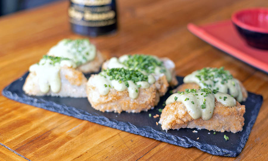 Grandes cortes de champiñones tempura con “vegadelphia” hecho en casa en su interior y bañados con salsa acevichada de cilantro y ciboulette. Bien, pero podrían mejor sus presentación.