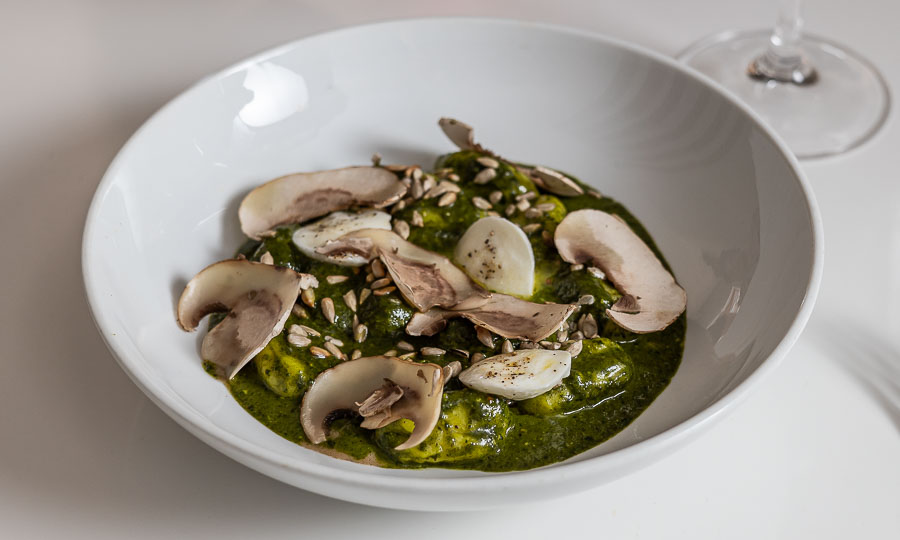 Impecable ñoquis de papa con un verde y natural pesto de espinacas salpicado con escamas de champiñones, cortes de queso boconccinis, semillas de maravilla y con un preciso toque de aceite trufado. Saca aplausos, delicioso , reconfortante y sano.