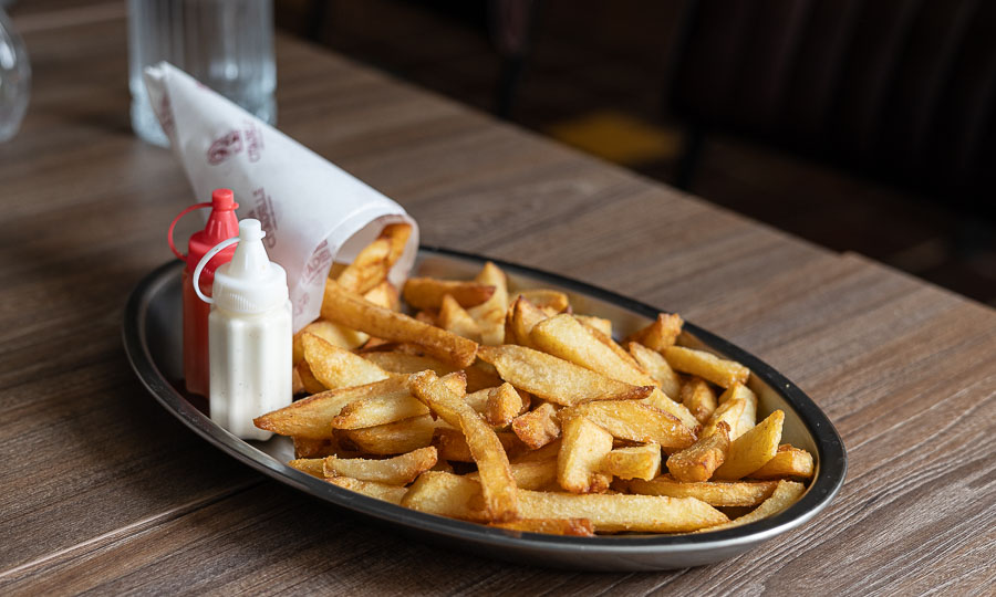 Una papas caseras tradicionales bien hechas, de crocante fritura y carnosas por dentro en un montaje lúdico con mini mamaderas de mayo alioli y ketchup casero.