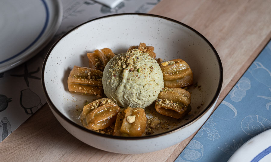 Helado de pistacho en esfera relleno con ganache de pistacho, con tulumbas (algo así como mini churros turcos) bañados en almíbar de arak. Interesante.