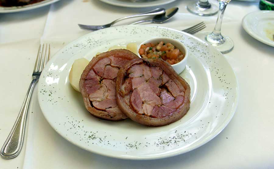 Dos gruesas láminas de arrollado huaso de buen aliño, rodados por una suave piel de chancho y acompañado por dos papas cocidas. Sin reinventar nada, este plato se gana el corazón y el paladar por lo simple y directo de sus sabores.