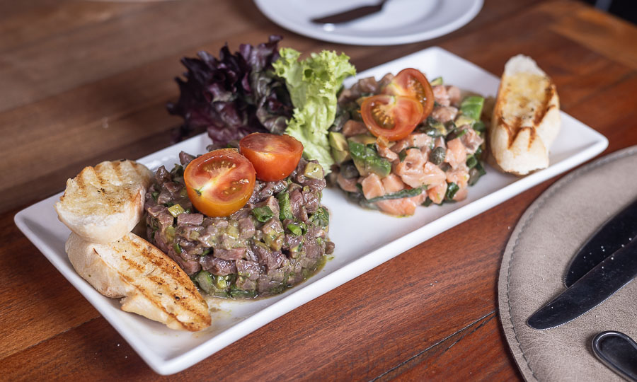 Son dos tártaros de aliño equivalente, uno de salmón y otro de carne, ambos picados rústicamente. Son sabrosos y golosos, pero con mucho cebollín que no les aporta mayormente. Seria bueno diferencia los aliños de cada uno.