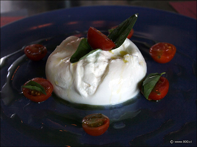 Ensalada con una Mozzarella di Bufala DOP, tomatitos cherry y hojas frescas de albahaca.