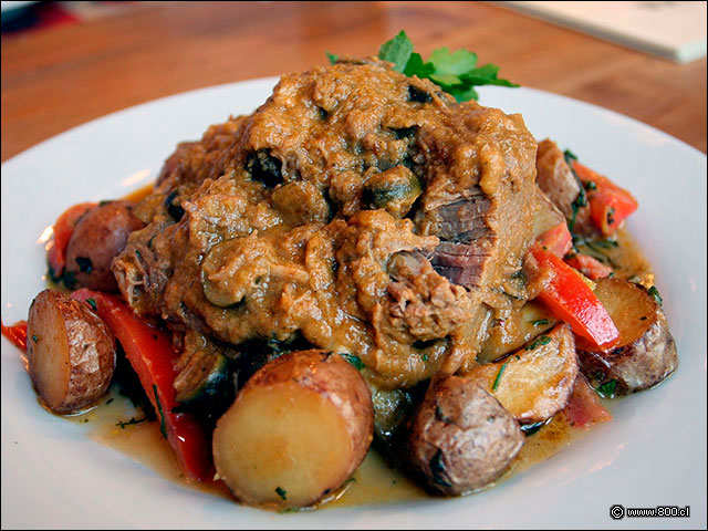 Agnello Alla Romana, trozos de cordero guisado servido sobre una cama de alcachofas, aceitunas, papas y tomate