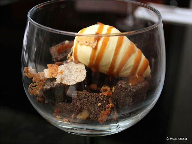 Brownie de chocolate con helado de vainilla y salsa de caramelo