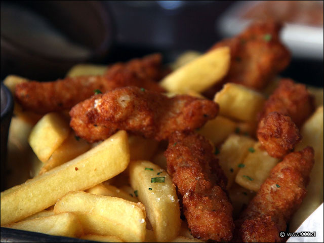Papas fritas y tiras de merluza frita en Fish & Chips