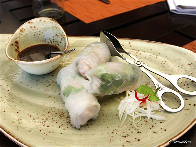 Spring rolls rellenos de vegetales salteados y servidos con salsa de ostra