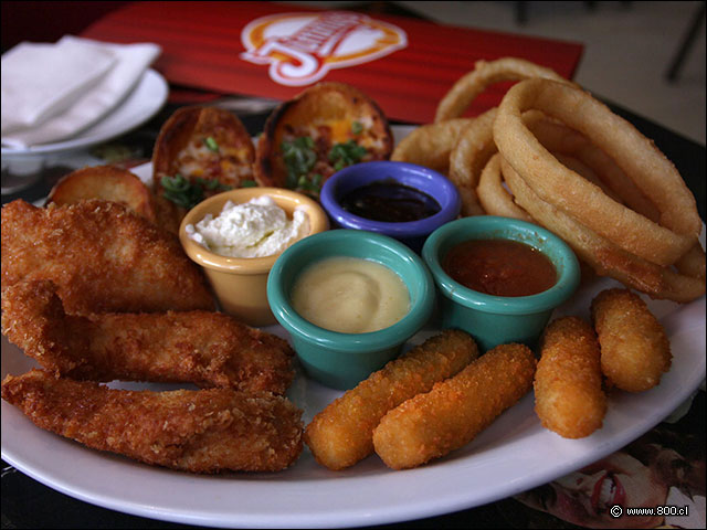 Jimmy's Super Sampler, pato con cáscaras de papa horneadas con eso, tiritas de pollo apando, aros de cebolla y mozzarella sticks