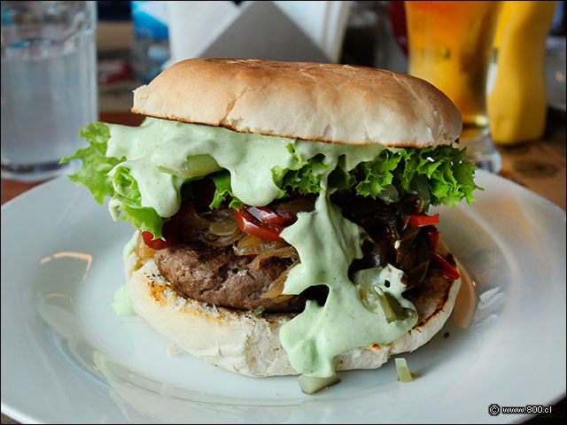 Fricandela con pepinillos, cebolla y pimientos asados, lechuga y mayonesa al cilantro