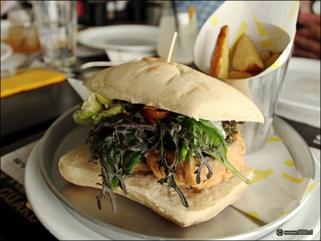 Sandwich de Cojinova frita acompañada de mayo a la aceituna y patines