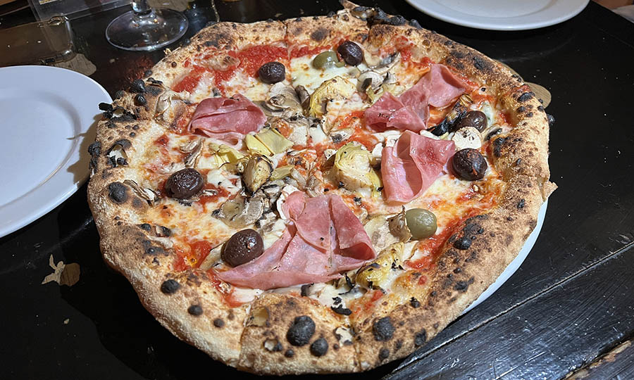 Salsa pomodoro, mozzarella fior de latte, gajos de alcachofas gratinadas, aceitunas riojanas, champiñones, prosciutto cotto (jamón cocido), albahaca.