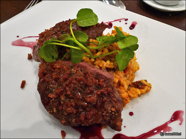 Lomo de vacuno con crocante de tocino y risotto de tomates secos