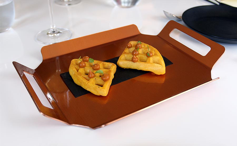 El clásico europeo y gringo en el restaurante Olam llega como cortesía servido con puntos de salsa romescu.