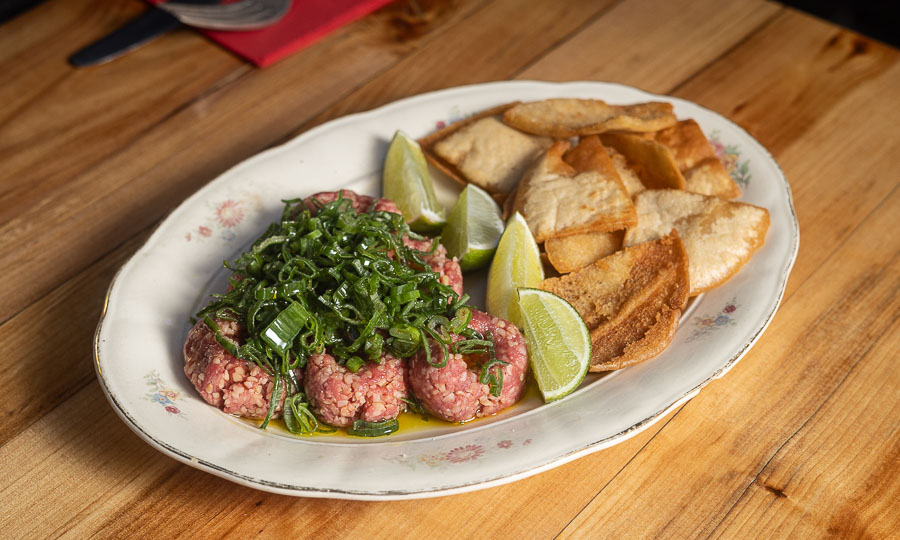 Deliciosas bolitas de carne cruda con burgol sobre buen de aceite de oliva con pimienta, coronadas con bastante cebollín picado aliñado -que juega un rol power en boca- y acompañadas de crocantes cortes de pan pita fritos y gajos de limón para aliñar. Atractiva presentación de carne limpia y purista para condimentar y terminar en cada bocado.