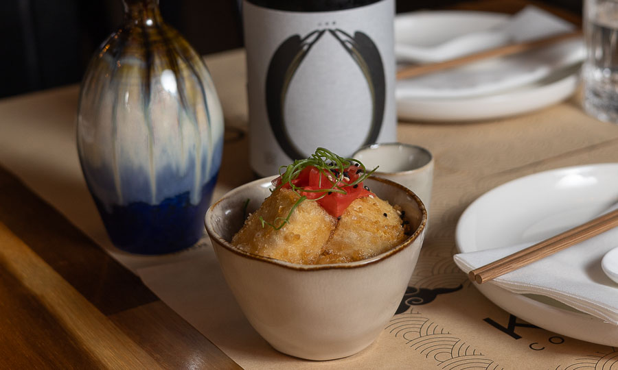 Buenos trozos de tofu de delicado sabor, con un elegante tempura que se remoja en una deliciosa salsa agridulce de perfil ahumado que se potencia con unos toques de jengibre encurtido. Un tofu sabroso, delicado y acertado.