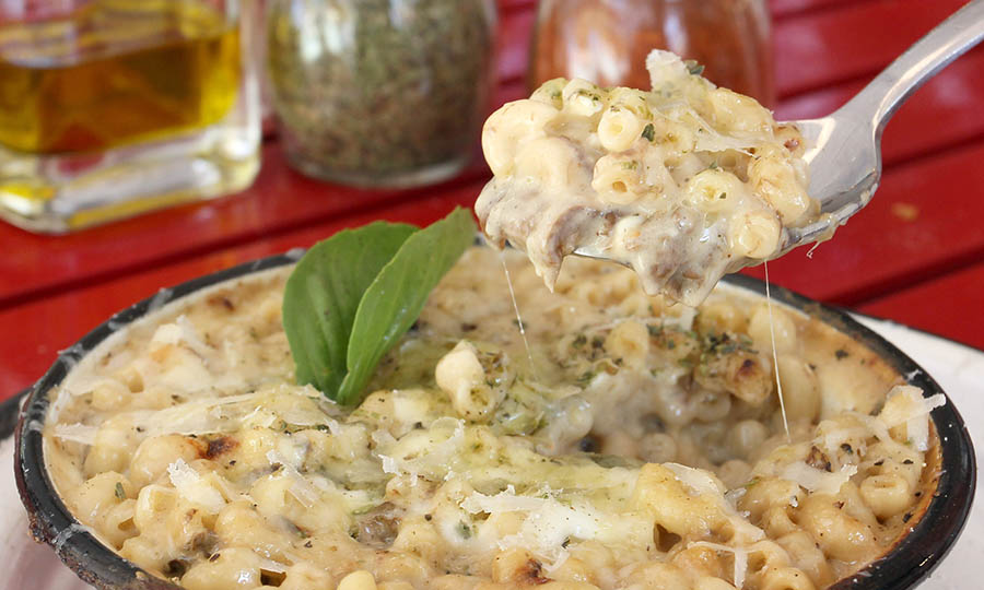 Una versión especial de un Mac & Cheese, en este caso con fideos coditos pequeños, con queso mascarpone mezclado con queso grana padano y un guiso de funghi porcini terminado con un toque de aceite de trufa blanca. Reconfortante.