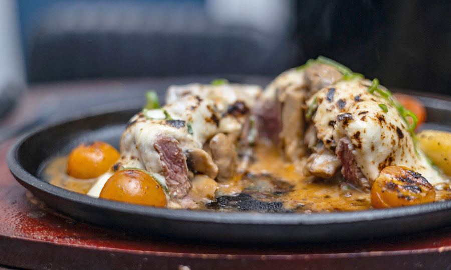 Un plato con show en mesa, el que se prende en llamas que emanan del ron con el que se baña el rollo de filete. Montado con champiñones al curry cubierto con queso de mano gratinado. Un plato original, jugoso y sabroso, con abundante de ese queso de mano venezolano que aporta en textura y su relleno de champiñones al curry que le dan un toque exótico.