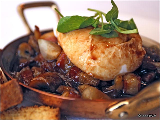 Huevo en meurette con salsa de vino tinto, chalotas, tocino y champiñones salteados