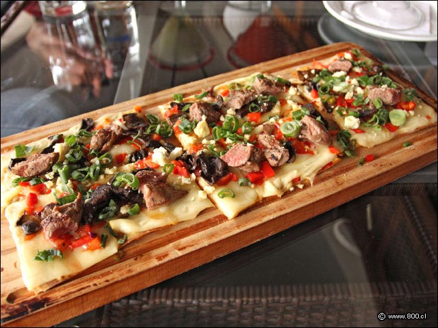 Queso azul, cebollín, hongos y trozos de carne en Steak Flatbread