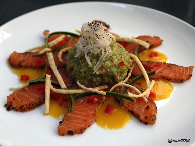 Pétalos de Salmón sellados y servidos con salsa de maracuyá.
