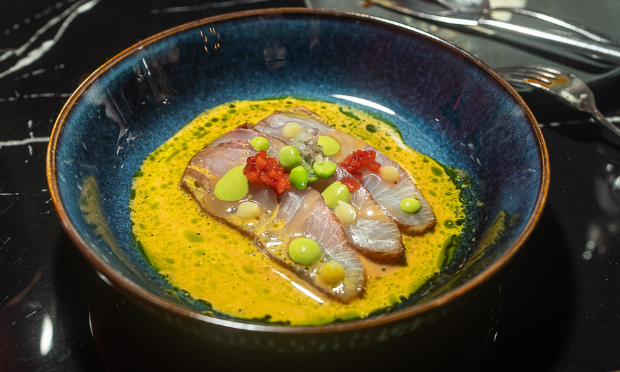 - Bonito curado en ajo negro y leche de almendras.