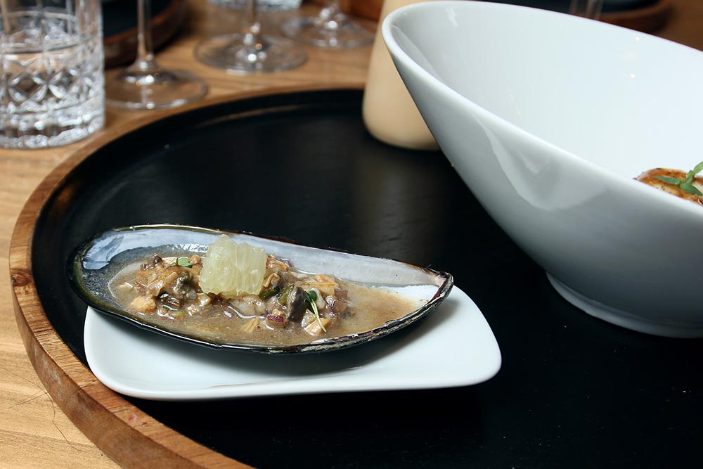Congrio en caldo con almejas y piure. Una de construcción de un caldillo de congrio en 3 partes, lleno de texturas y sabores marino. Un congrio de provocación y balance.