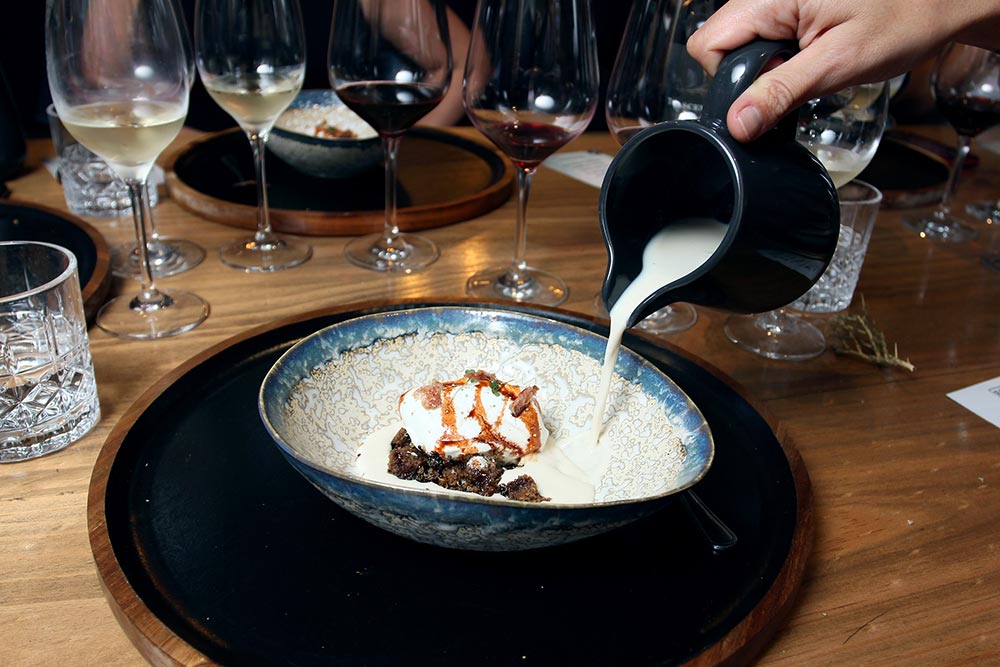 Tartar de guanaco con avellanas chilenas sobre un milcao con guanciale ahumado, y fermentos, en elaborado montaje con ramas de rica rica. Atrevido.