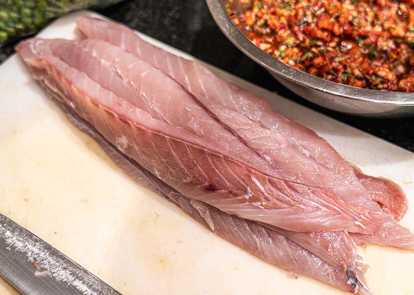 - Luego, un tiradito de pescado blanco con leche de tigre y piure, donde el mar se expresa en profundidad y umami.