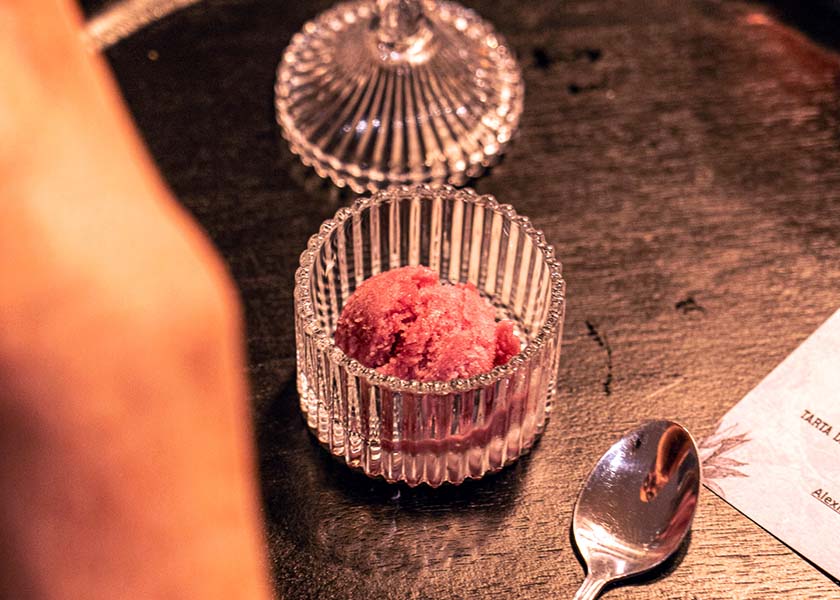 - El viaje comenzó con un helado de choclos y tomate, fresco y sutil, seguido por un snack de malaya de cerdo con chimichurri, intenso y lleno de carácter.